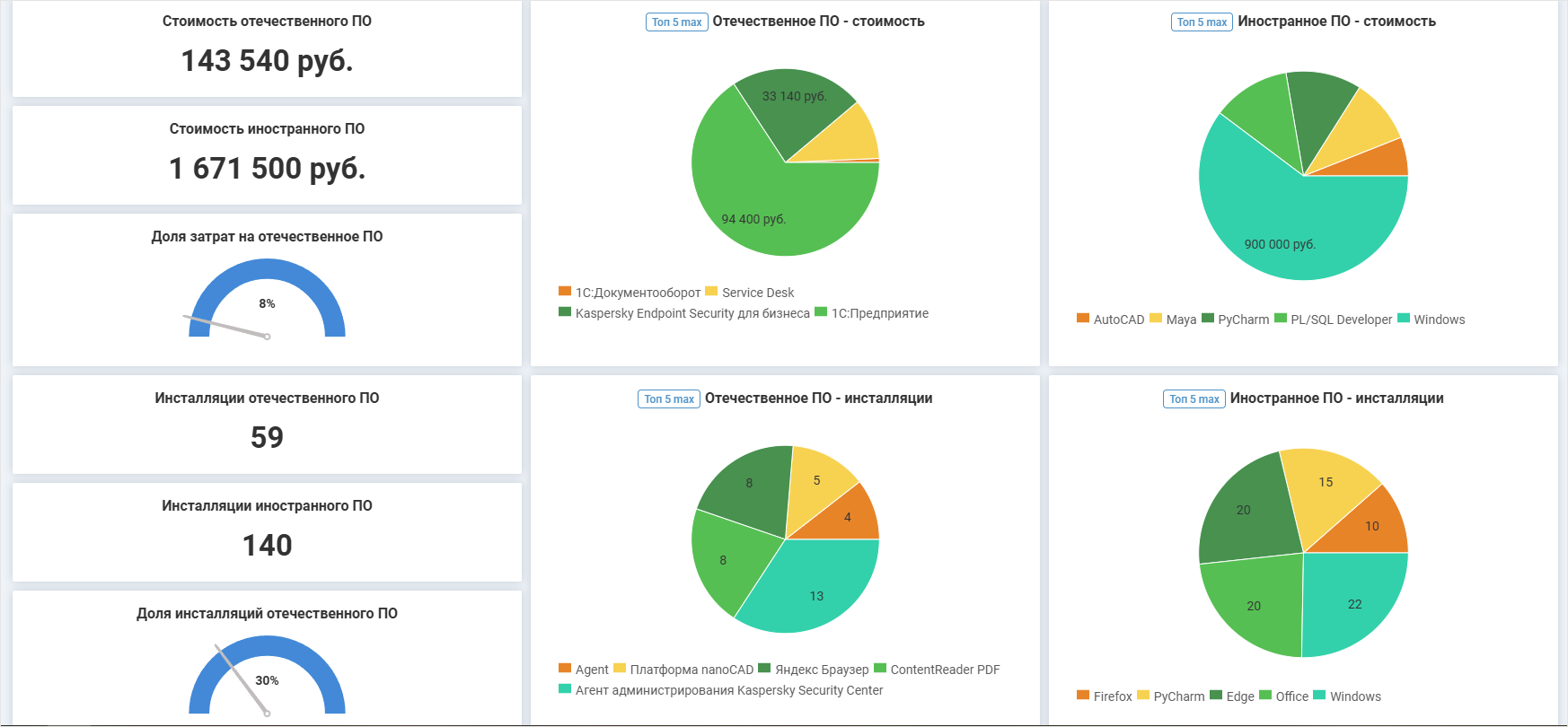 На дашборд «Импортозамещение» выводятся данные о программных продуктах, которые использует компания