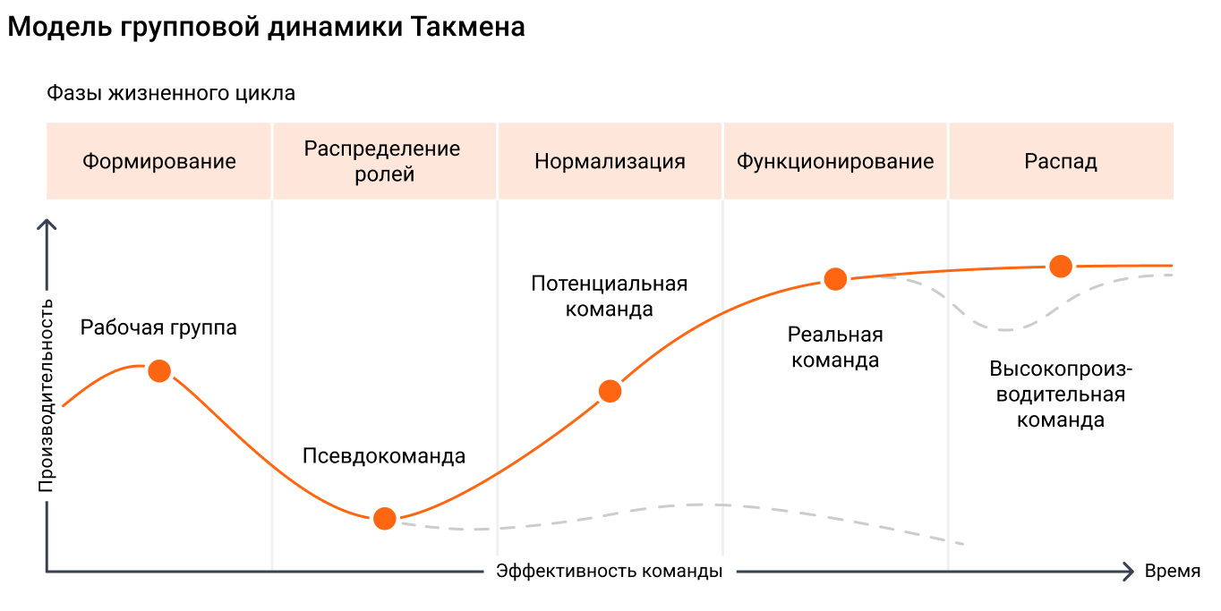 Групповая динамика. Теория разработана Брюсом Такменом (Bruce Tuckman). В ней описывается жизненный цикл групп. Согласно этой теории у группы есть следующие стадии развития: