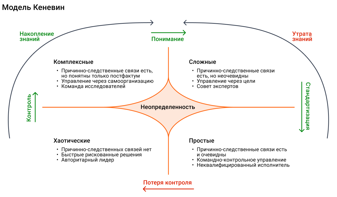 Когда знания накапливаются, мы перемещаемся по часовой стрелке: берем под контроль хаос, начинаем понимать систему, а в конце стандартизуем действия и решения.