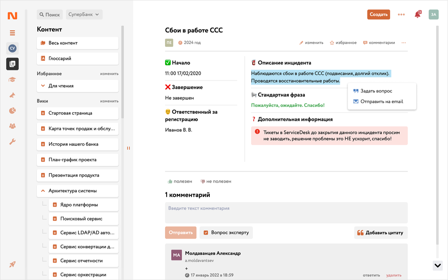 Актуальные данные в базе знаний улучшают качество техподдержки. Например, позволяют информировать о сбоях и восстановлении работоспособности