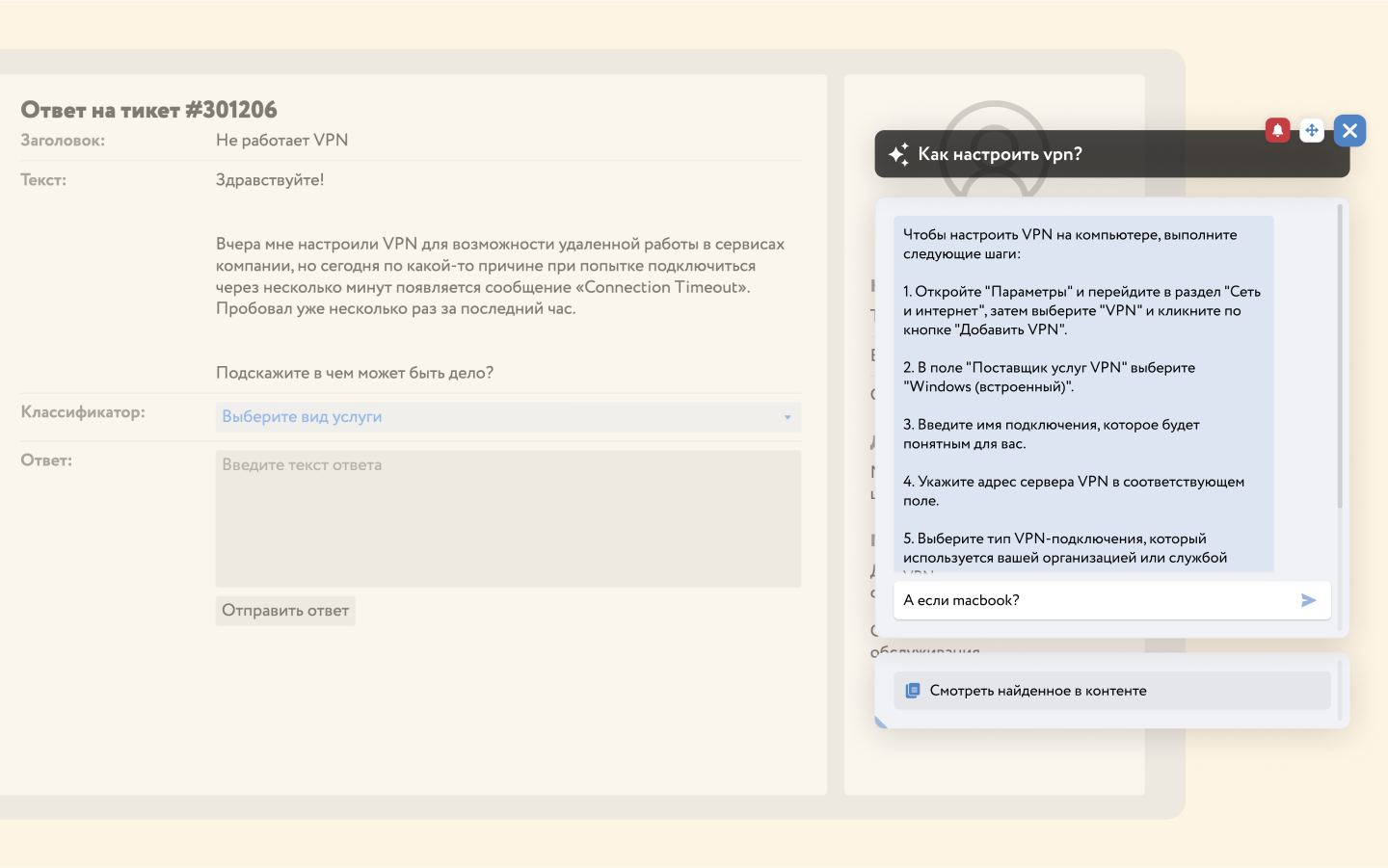 ИИ-ассистент для первой линии поддержки помогает самостоятельно закрывать типовые запросы пользователей. Интеллектуальный поиск и анализ осуществляется только на основе материалов в базе знаний. Если они качественные и структурированные, точность ответов более 90%. Такой подход значительно ускоряет обработку обращений и соблюдение SLA. Оператор проверит ответ ИИ по указанным источникам и отправит пользователю, не эскалируя запрос на вторую и третью линию.