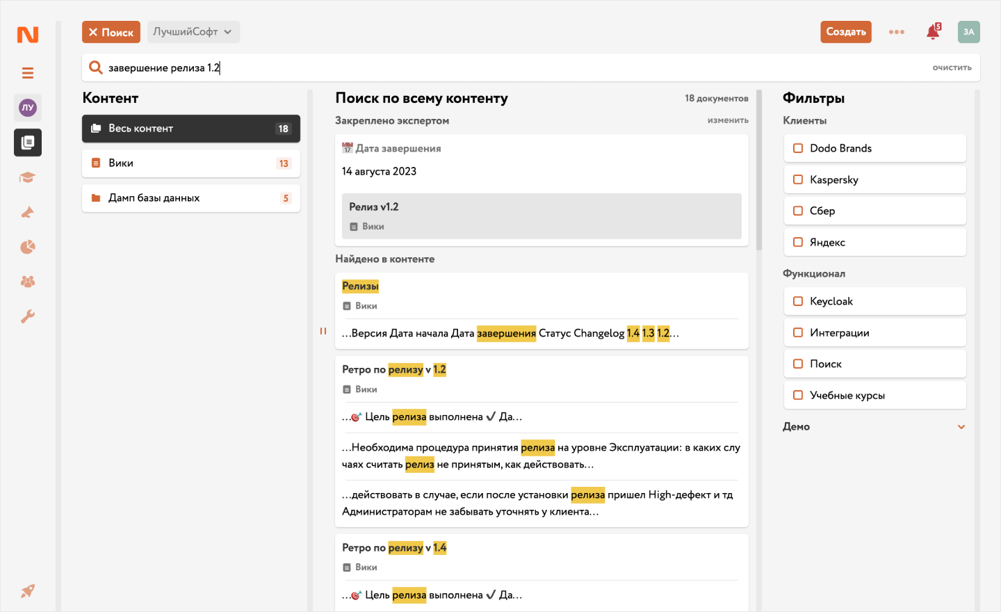 Возможности Naumen KMS позволяют создавать новые знания, находить и применять в реальных рабочих ситуациях. Навигацию упрощают теги, фильтры, поисковые подсказки, сниппеты.