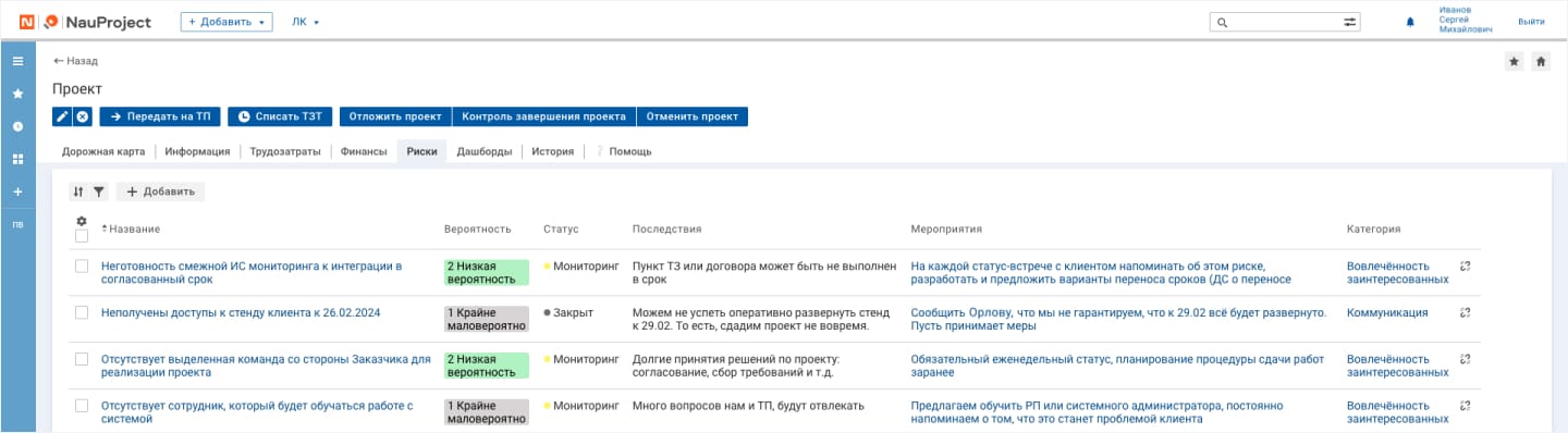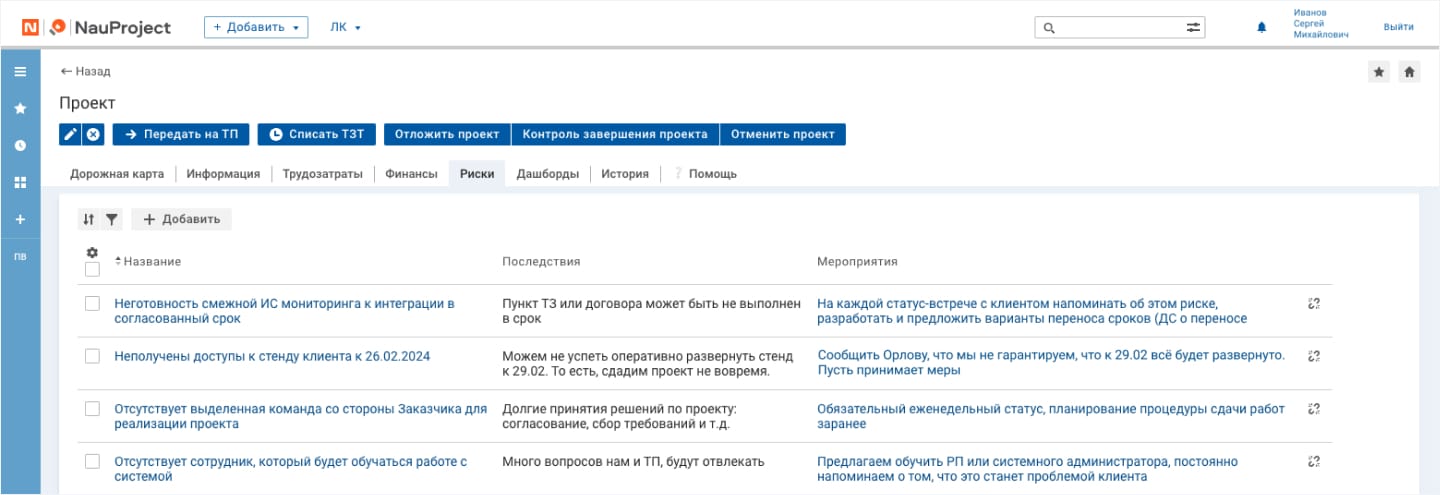 В Naumen Project Ruler на одном экране можно видеть всю последовательность: риск — последствия — мероприятия