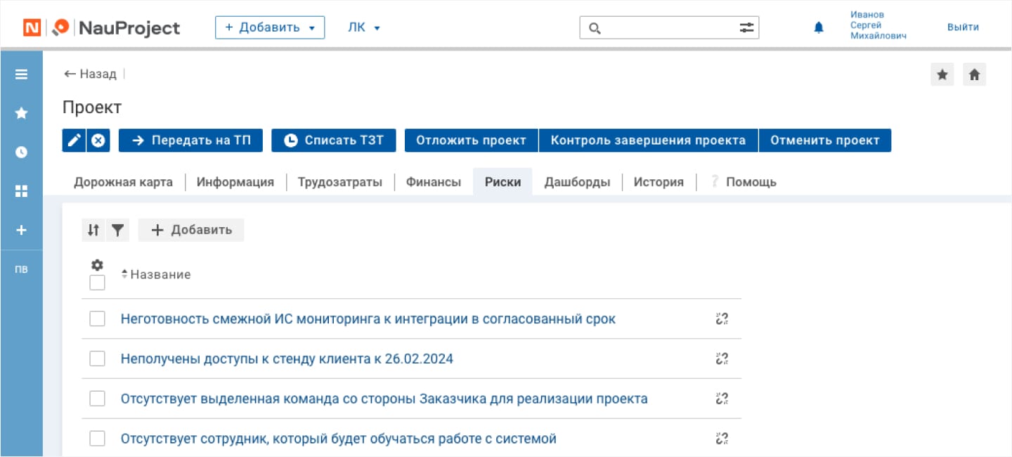 В Naumen Project Ruler риски по проекту отображаются списком. В каждый можно «провалиться» и посмотреть подробности: описание и работу, которая по нему запланирована