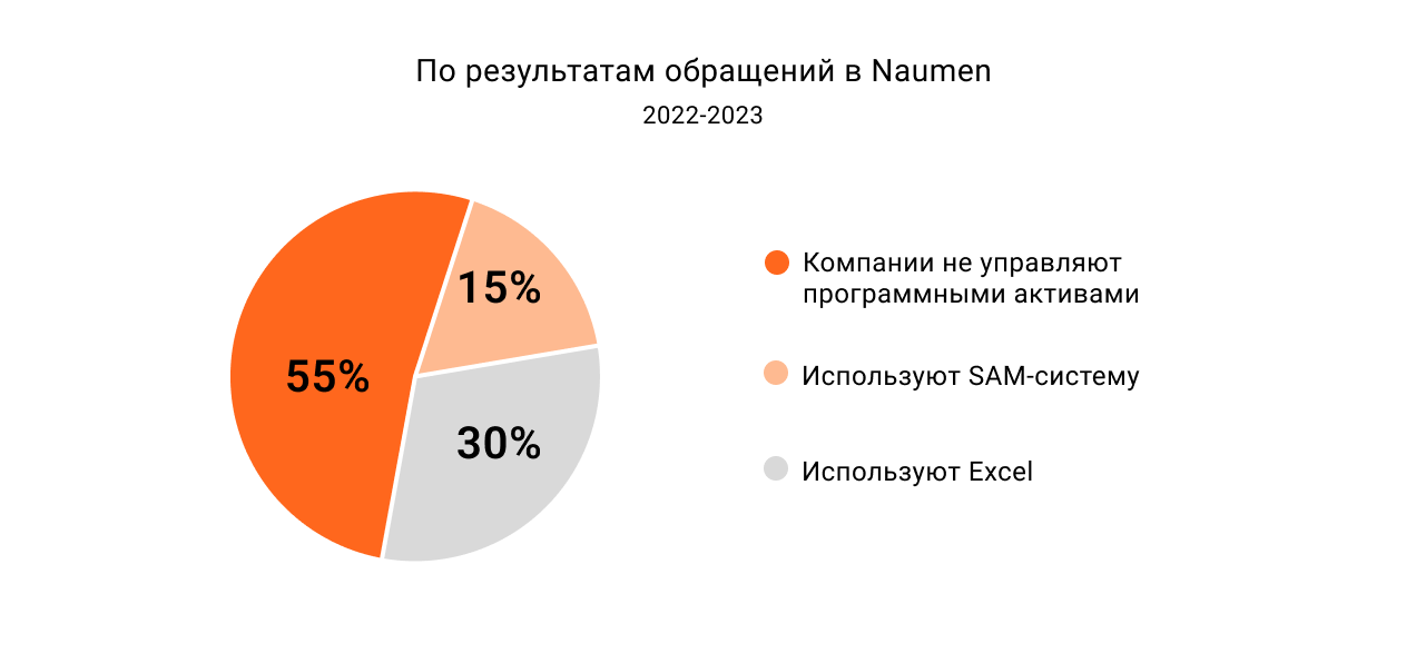 Согласно анализу статистики запросов в Naumen, только 15% компаний уже используют SAM-систему для управления ПО и подходят к этому вопросу комплексно