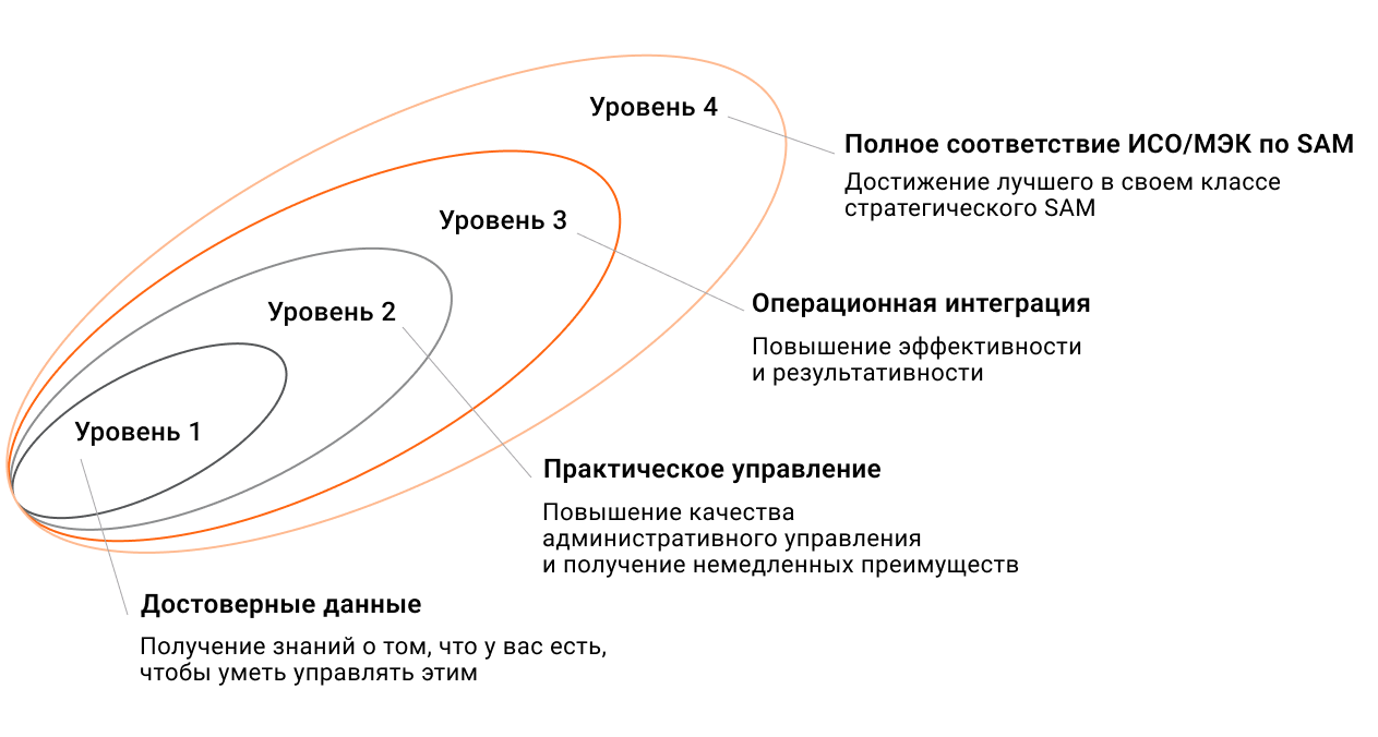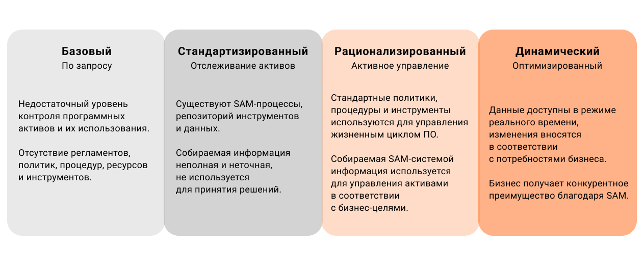Уровни зрелости отличаются между собой степенью развитости процессов, команды и инструментов автоматизации, которые в совокупности обеспечивают эффективность SAM. Разберем каждый уровень подробнее.