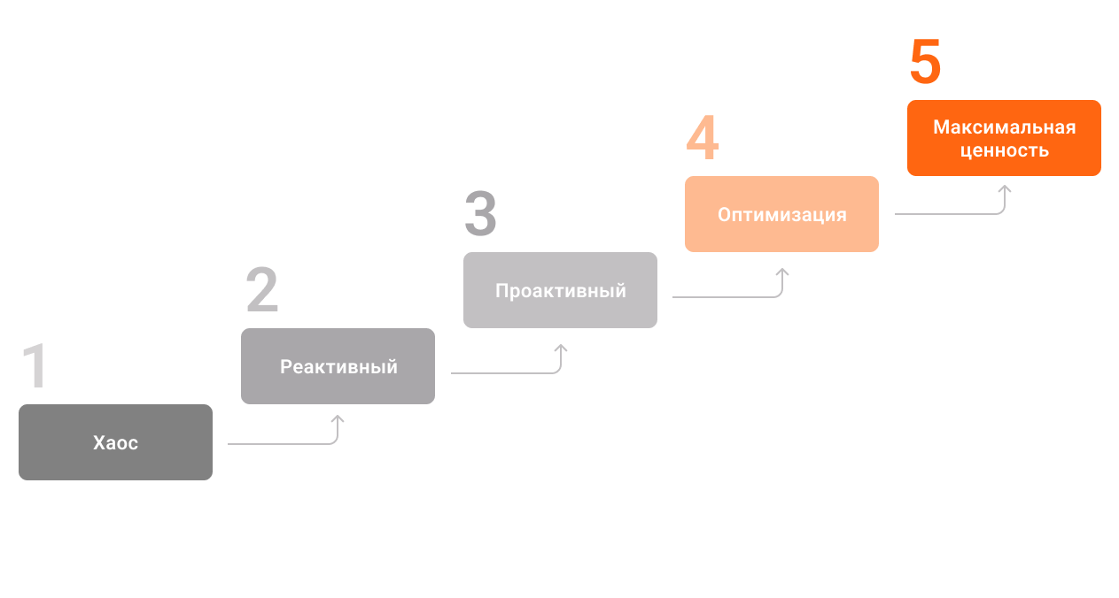 В среднем, путь от хаоса до достижения максимальной ценности занимает около двух лет. На практике сроки во многом зависят от размера организации, мотивации руководства и объема финансирования.
