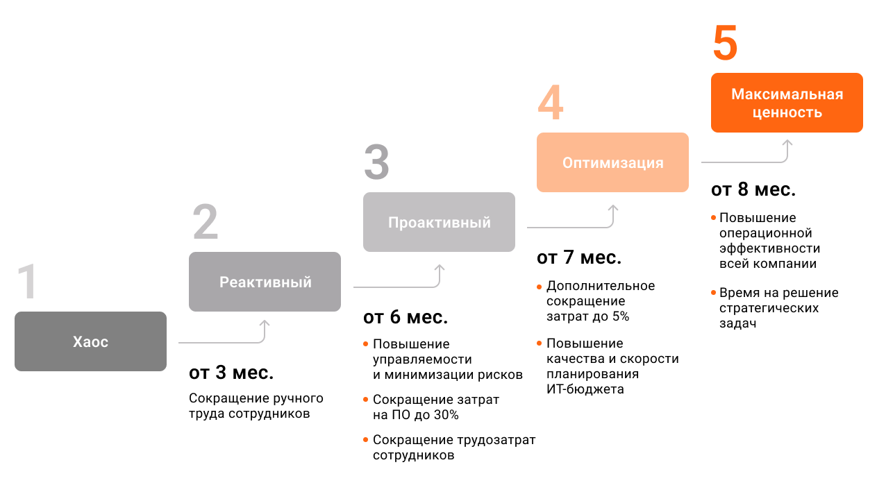 Экономический эффект от действий на этом этапе скорее накопительный. Это постепенная оптимизация за счет точного понимания, что нужно компании, и составление плана на будущее. Так, компания сможет принимать взвешенные решения о расходах, когда придет время для переговоров с вендором по контракту или продления лицензий.