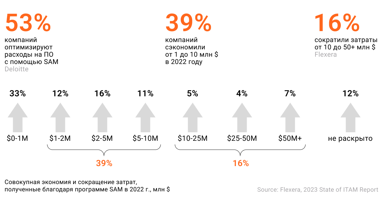 Фактически это говорит о том, что уровень зрелости SAM низкий, также как и уровень понимания реальных выгод от инвестиций в SAM. Компаниям не очевидно, как и с помощью каких инструментов повысить эффективность процесса для достижения ощутимых