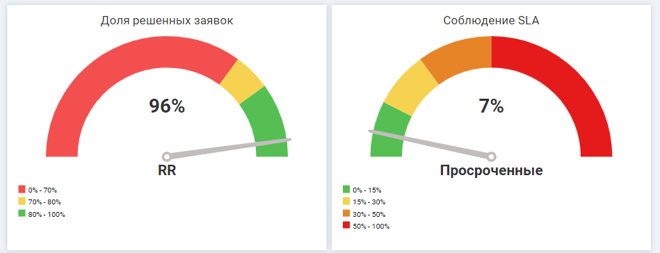 Доля решенных заявок (RR, Resolution Rate) показывает, сколько процентов из всех поступивших выполнено за определенный период времени. Если показатель растет, значит команда справляется с текущим потоком задач, а если уменьшается — это повод проанализировать, что мешает сотрудникам работать с прежней эффективностью.