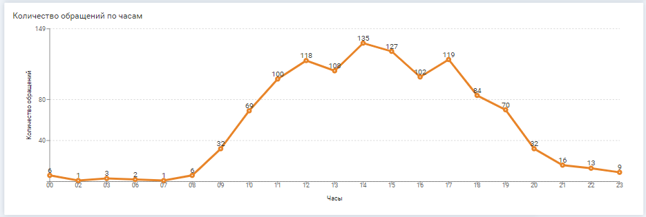 Загруженность по часам представит объем заявок с распределением по временному периоду за день. Метрика покажет наиболее загруженное время службы поддержки. Чтобы снизить нагрузку в пиковые часы, можно изменить режим работы. Например, временно выводить на первую линию поддержки сотрудников из второй, а если поддержка работает круглосуточно, поменять график дежурств, чтобы на самое активное время выходило несколько специалистов.