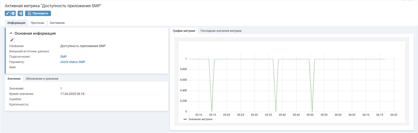 Активная метрика «Доступность приложения SMP» показывает состояние на уровне «доступен» или «недоступен»