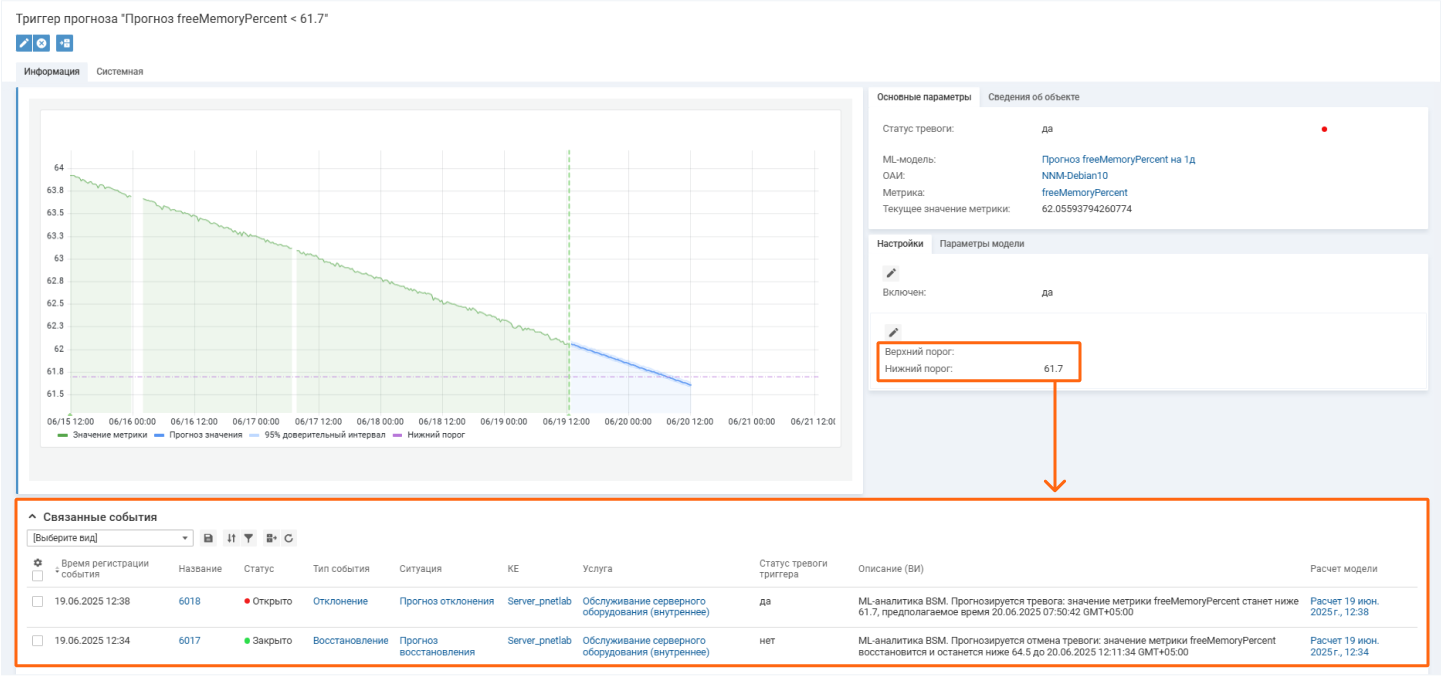 Допустим, для метрики freeMemoryPercent (Свободная память в процентах) критическими будут значения ниже 60%. В таком случае можно настроить триггер прогноза, в котором для нижнего порога указать значение 60. Представим, модель спрогнозировала, что через 6 часов значение метрики выйдет за допустимые пределы. Далее сработает триггер, и автоматически в Naumen BSM будет создано событие прогноза.