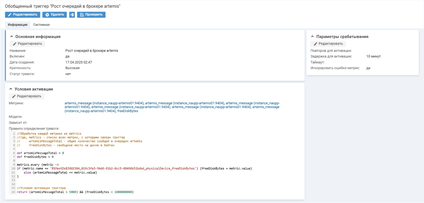 Обобщенный триггер учитывает пороговые значения одновременно нескольких метрик. Условие срабатывания триггера гибко настраивается через скрипты. При этом предусмотрена возможность устанавливать дополнительные параметры срабатывания, например, указать задержку активации на