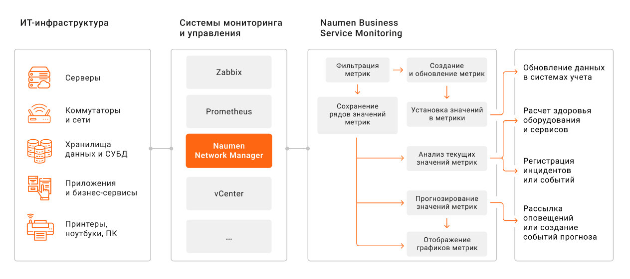 Как это работает? Naumen BSM фильтрует и обогащает данные, а затем запускает различные процессы, в том числе в смежных системах.