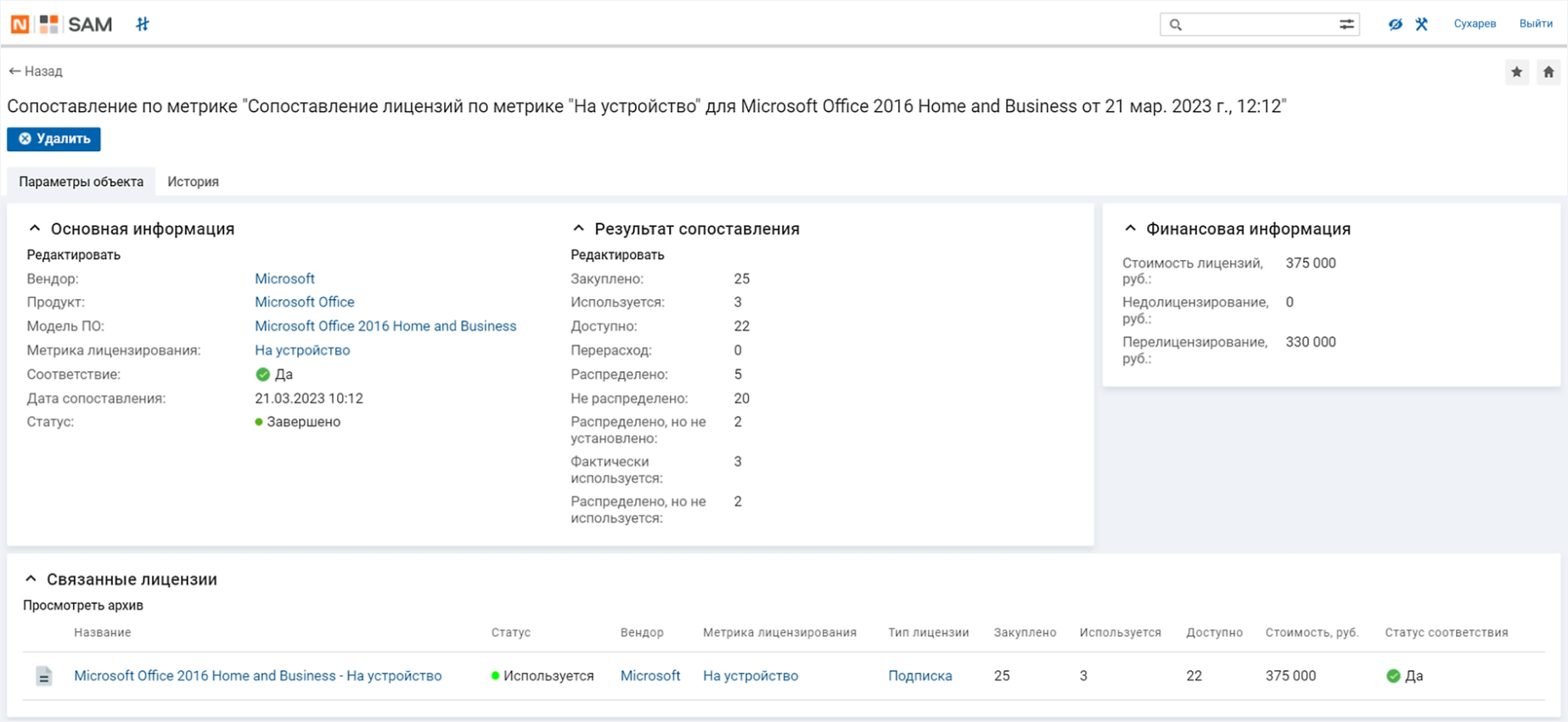 Оптимизация количества лицензий. Naumen SAM позволяет автоматически проводить лицензионную сверку. Ее результат — данные о количестве приобретенных лицензий и о том, сколько из них действительно используются. Невостребованные лицензии могут быть прекращены или переданы другим сотрудникам.