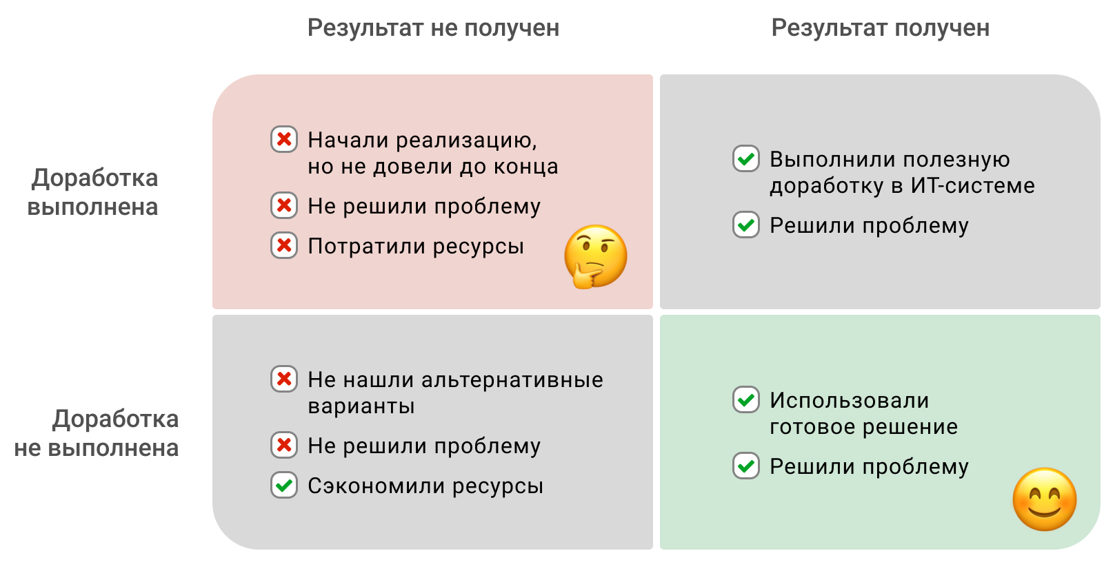 Формирование ответов на эти вопросы позволит вычленить те доработки, которые нужны (есть конкретная проблема и функциональный заказчик), будут эксплуатироваться (есть исполнители), контролироваться и управляться (есть менеджеры).