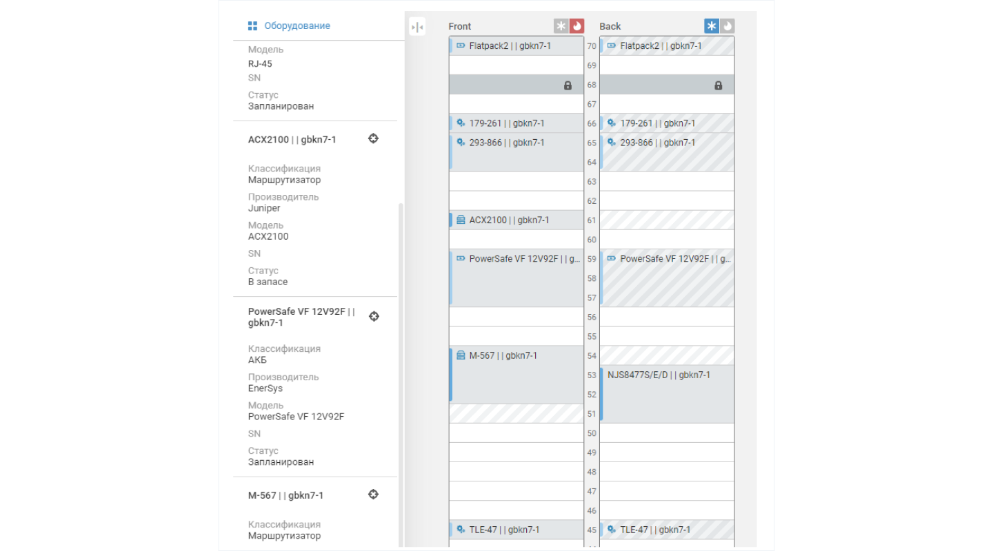 Без автоматизации. В большинстве случаев в документации будет просто указано наличие стойки, ее модель и текстовый документ — спецификация. Регулярно описывать и отражать в них ситуацию с занятостью слотов на оборудовании такого типа почти нереально. И тем более представлять это графически. Чтобы планировать организацию и подключения устройств, специалистам придется предварительно проверить участок и оценить ресурс и состояние стоек и портов.