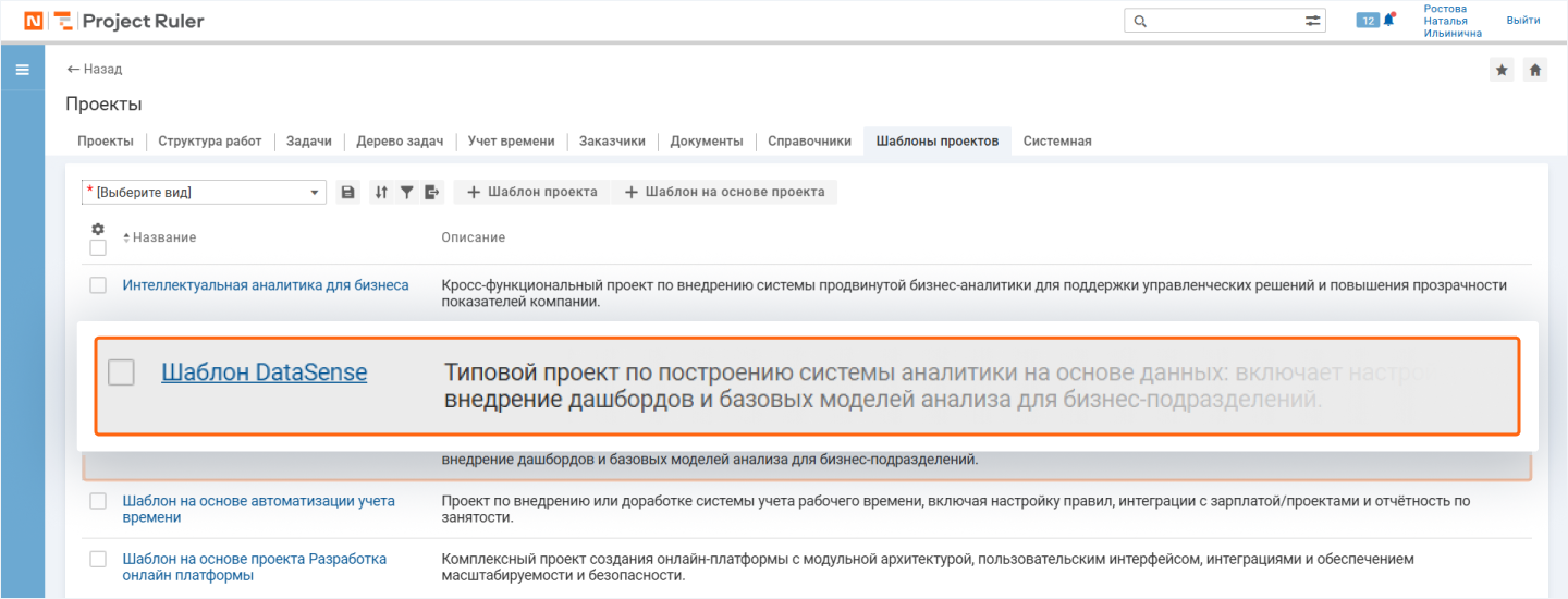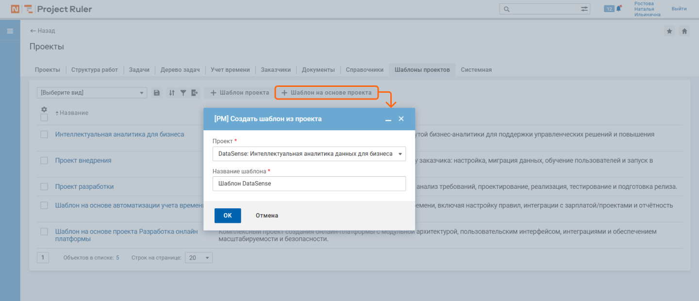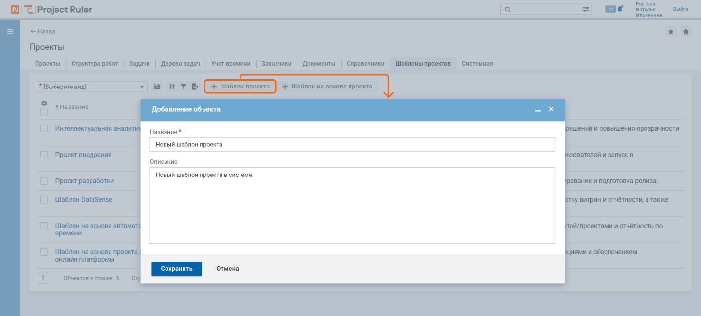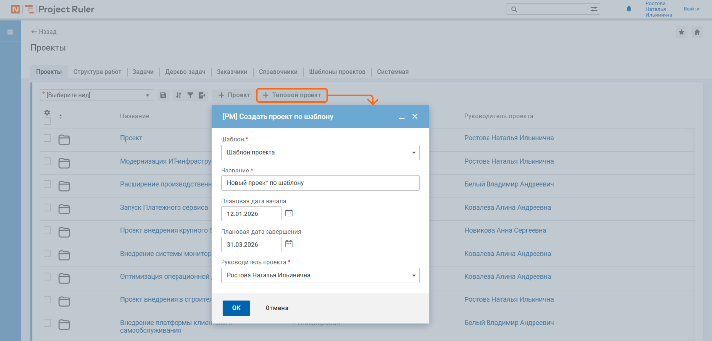Запуск нового проекта на основе шаблона в Naumen Project Ruler