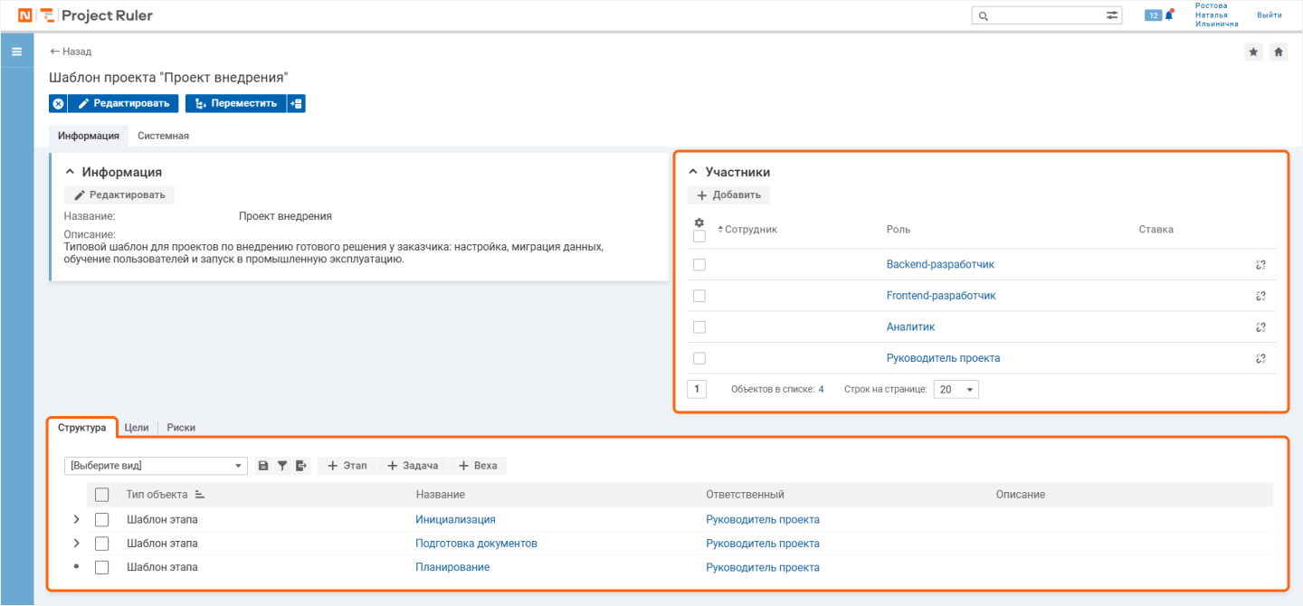 - Переходим в созданный шаблон и проверяем, что все вложенные объекты, параметры и настройки исходника, включая этапы, вехи, задачи, риски, цели, перенесены.