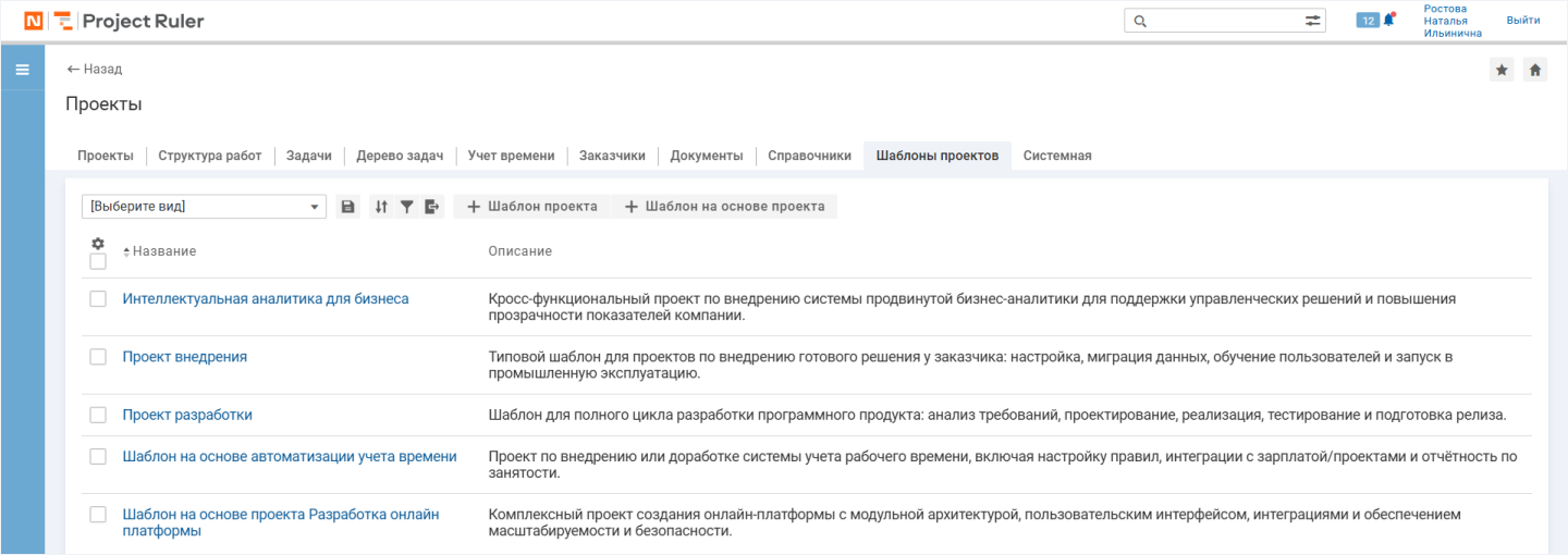 Часто проекты в рамках одной компании почти идентичны или очень похожи. А значит, планируются и выполняются по единым принципам. Чтобы ускорить подготовку проекта, в системе Naumen Project Ruler (NPR) реализованы шаблоны. Инструмент работает как любой другой шаблон: подразумевает преднастройки, которые берутся за основу при создании однотипного объекта.